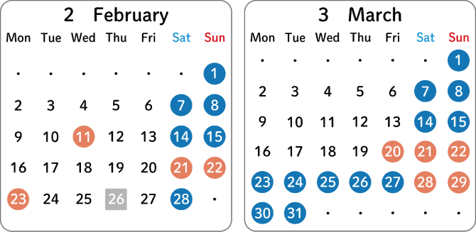 無色:2,000日圓 ●:2,200日圓 ●:2,500日圓 ■:休館日 ※價格均含稅